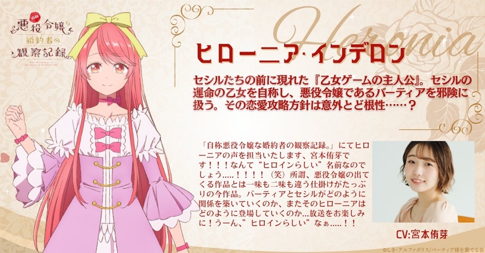 ¡¡¡Soy Yume Miyamoto!!! Prestaré mi voz a Heronia en An Observation Log of My Fiancée Who Calls Herself a Villainess. ¡¡¡Qué nombre tan digno de una ‘heroína’…!!!! (risas). Esta obra está llena de giros y vueltas que la distinguen de las historias típicas de villanas. ¿Cómo construirán su relación Bertia y Cecil? ¿Y cómo hará su entrada Heronia…? ¡Estén atentos a la transmisión! Hmm, realmente es muy de ‘heroína’…!!